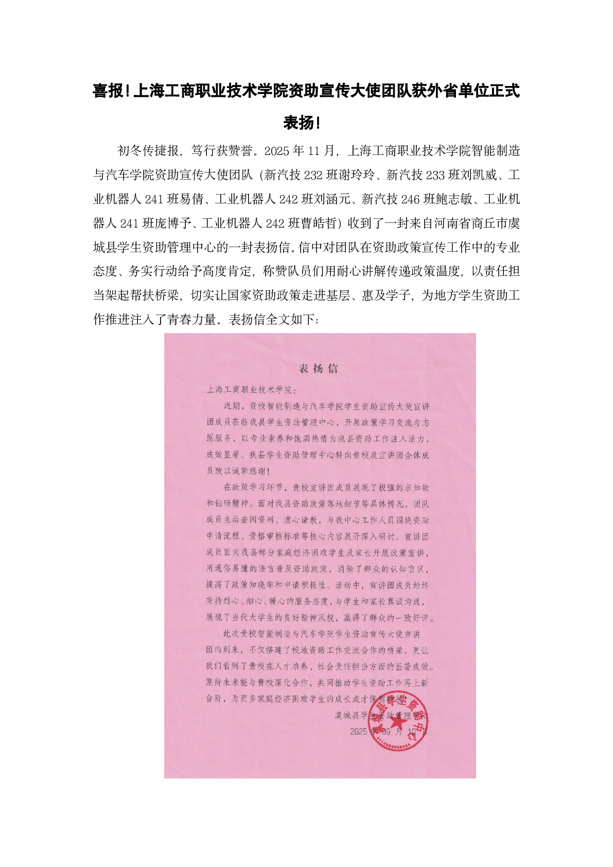 喜报!上海工商职业技术学院资助宣传大使团队获外省单位正式表扬!