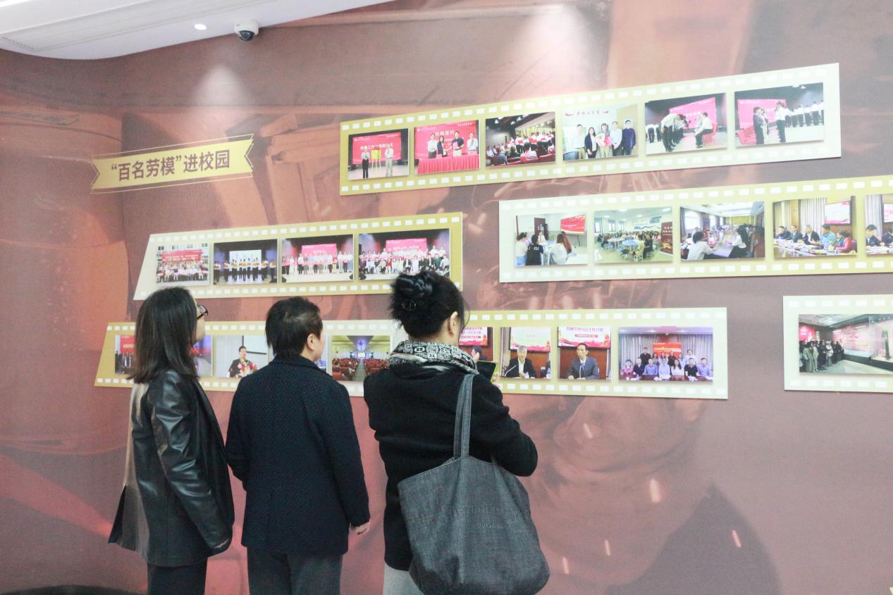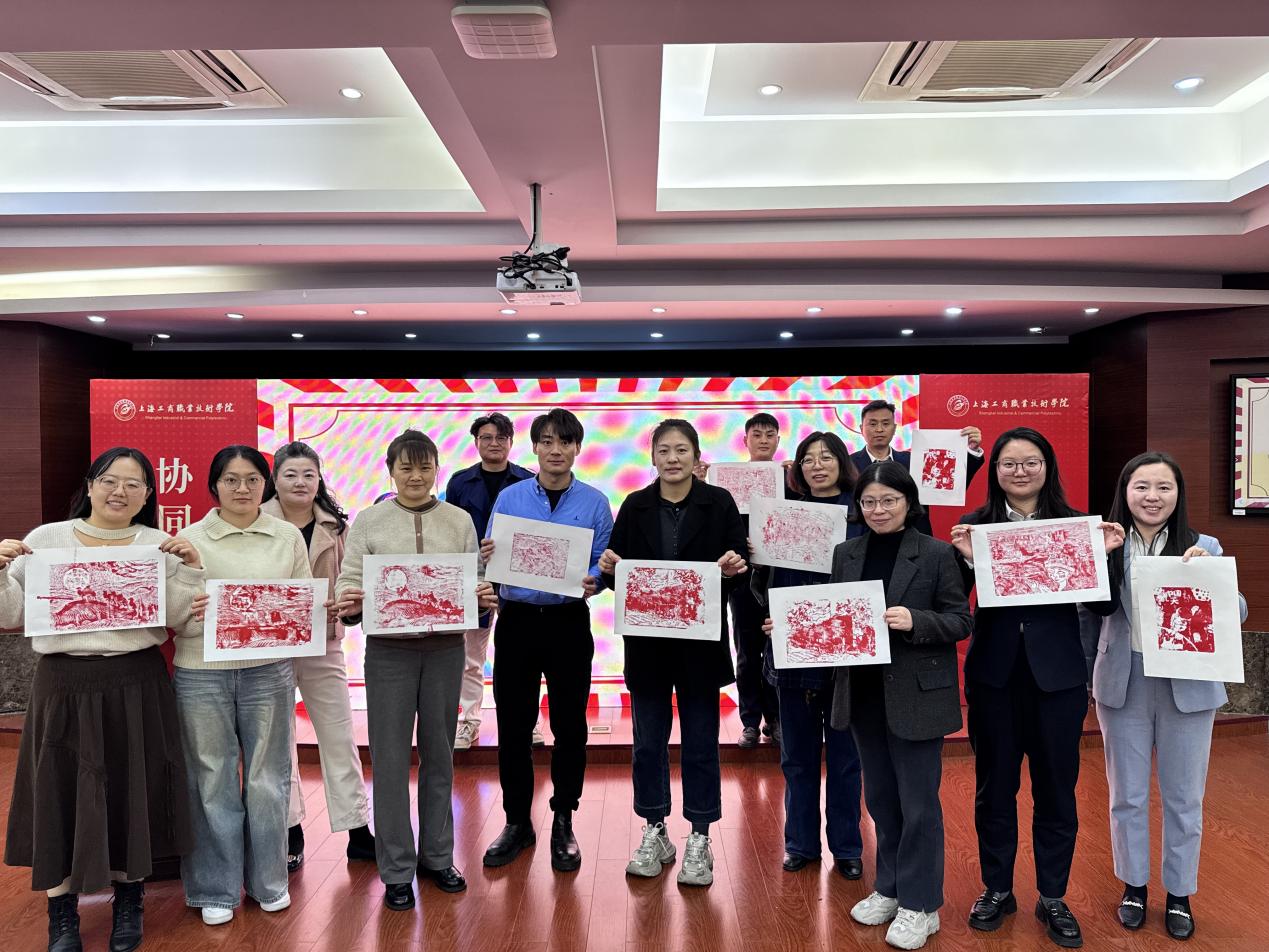 研讨会后,与会领导嘉宾参观我校劳模工匠风采展示馆,并参与实践活动。活动邀请我校商学院教师王敏妍、上海工会管理职业学院潘秋烨担任指导。活动中,王敏妍耐心演示了串珠的穿引技法,而潘秋烨引领大家沉浸于版画制作,现场氛围专注而热烈。