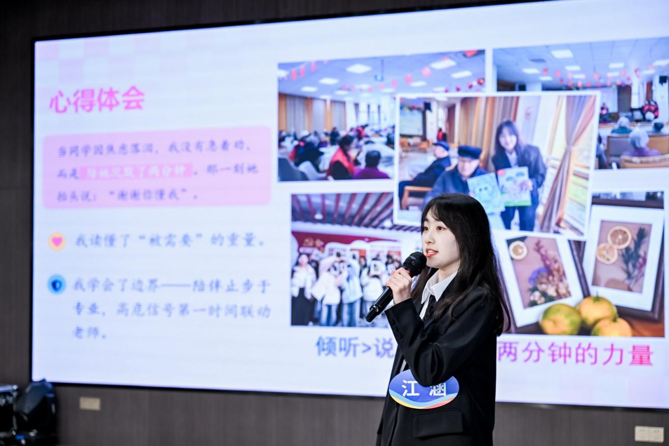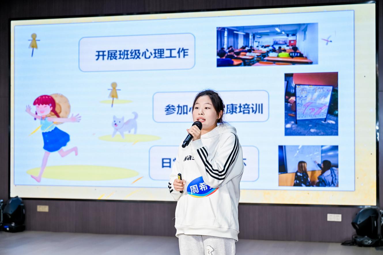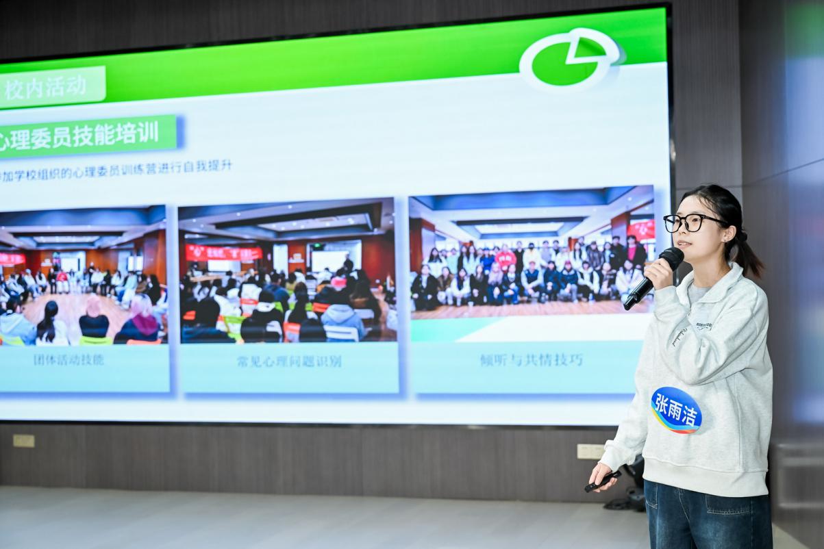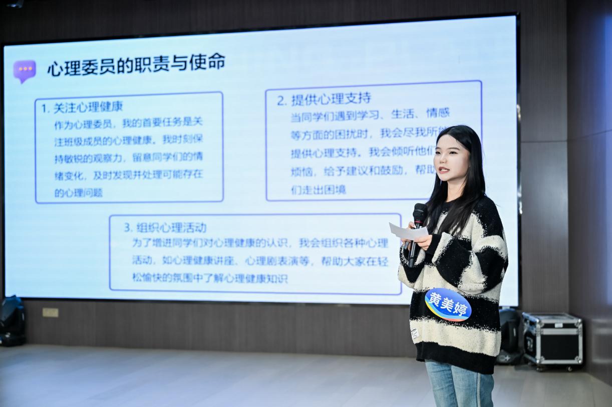 来自四所高校的8名优秀心理委员根据抽签顺序依次登场,结合PPT进行限时展示。他们从自我认知、工作叙事、典型案例、活动组织、成长体悟等多维度,生动讲述了身为“心灵伙伴”的初心、实践与思考。展示内容既有对学业压力、人际交往等常见心理议题的深刻洞察,也展现了他们在班级层面开展心理健康宣传、组织团体活动、提供初步朋辈支持的扎实功底,彰显了新时代大学生骨干的责任感与生命力。