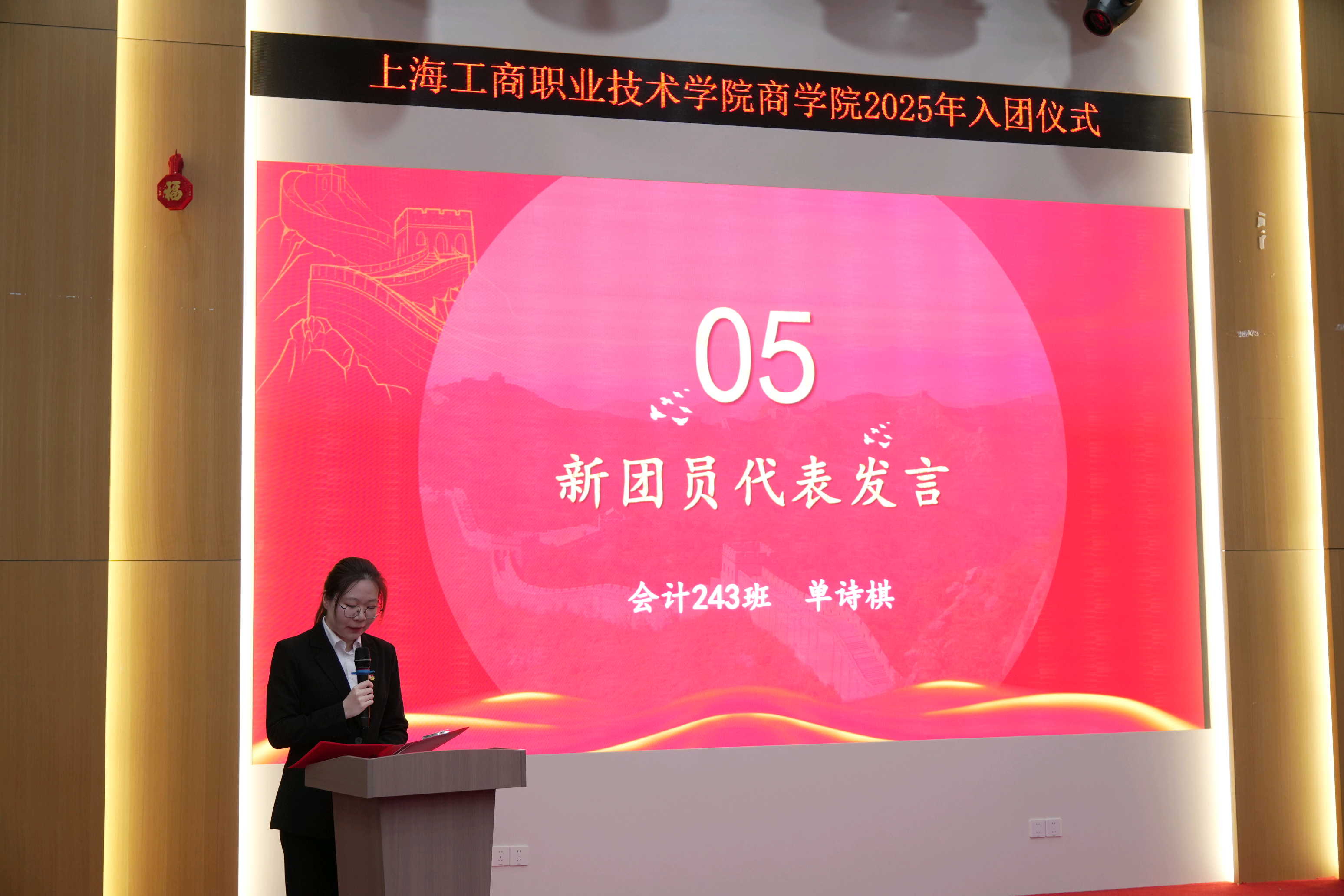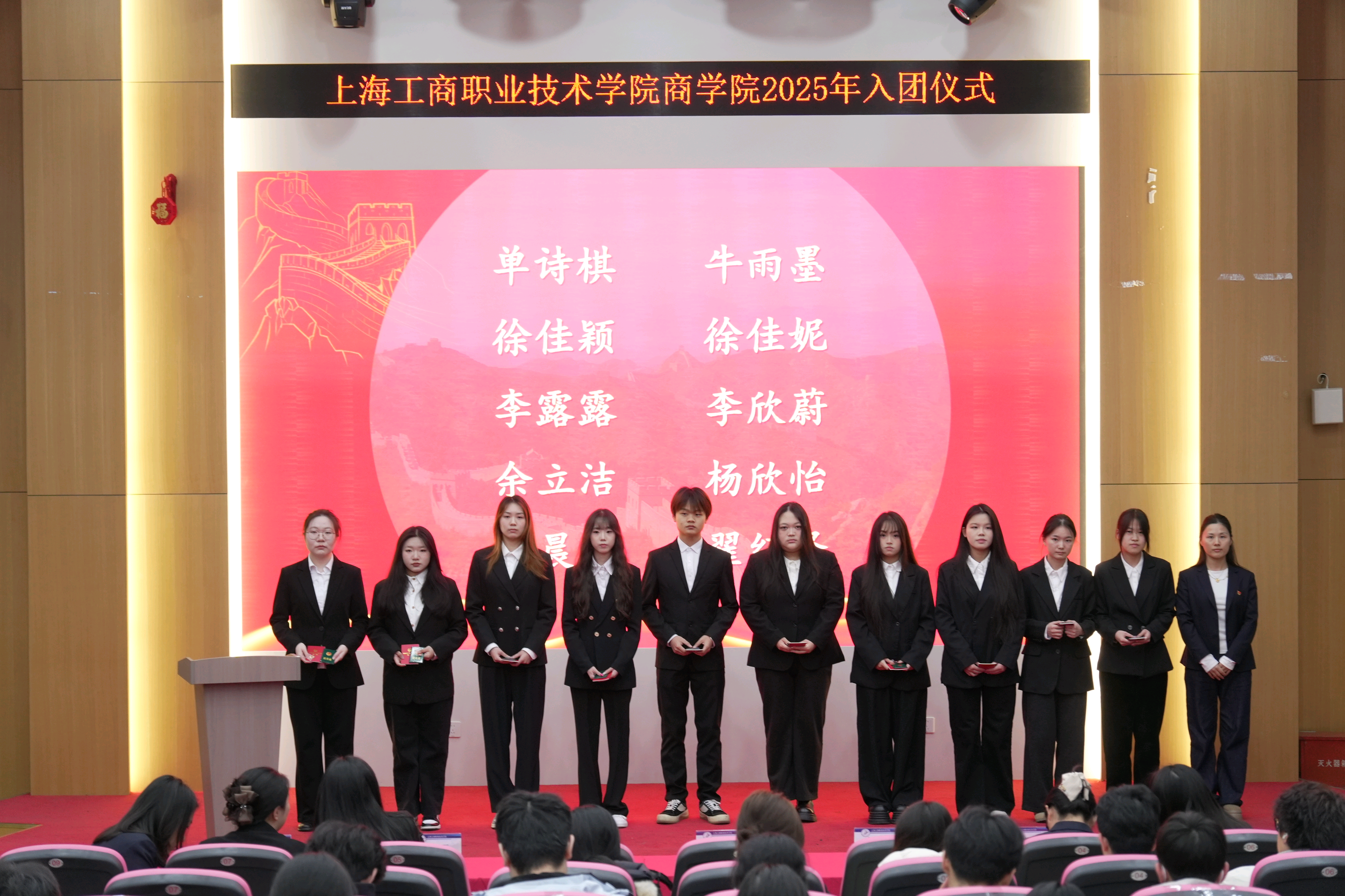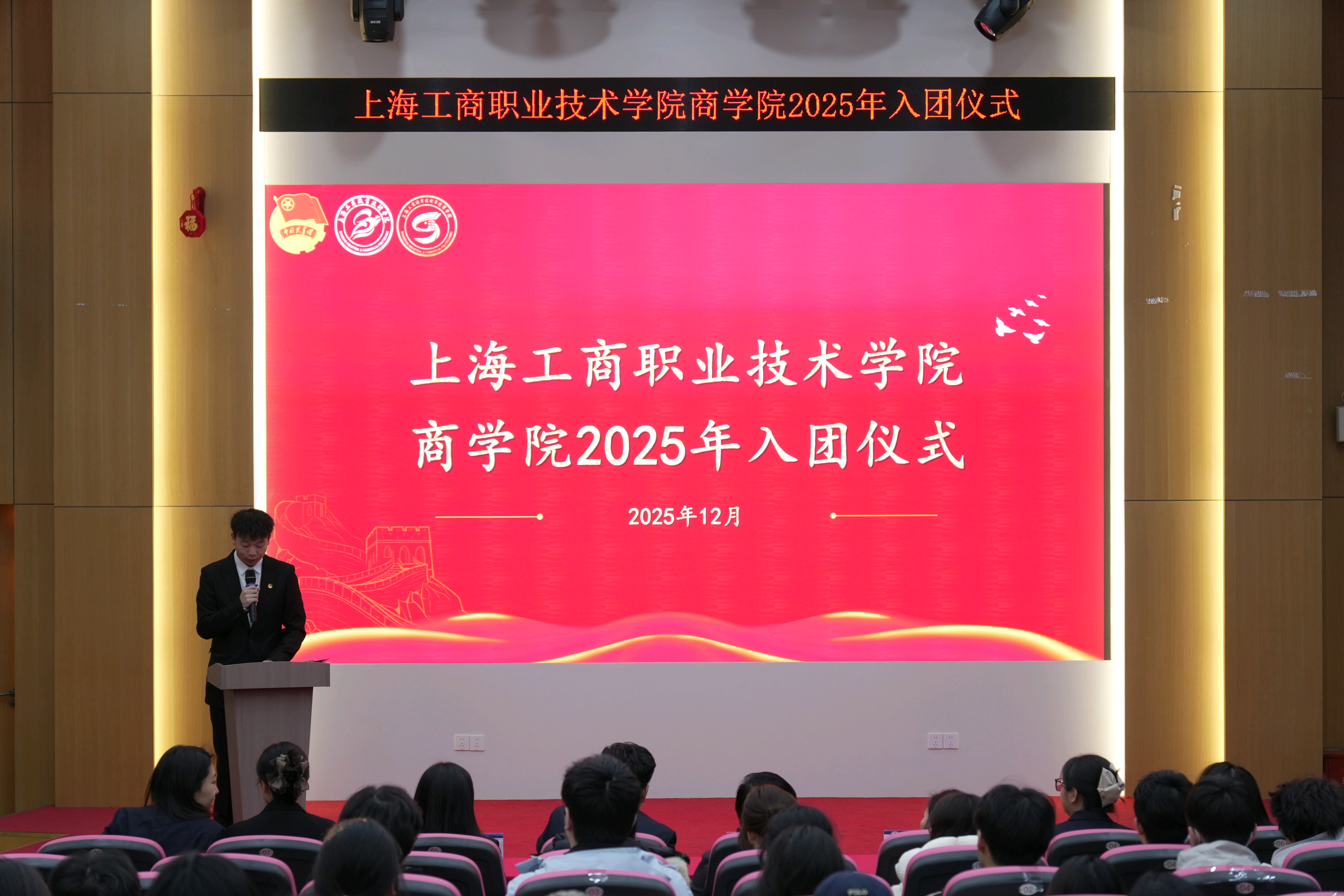 为加强青年思想政治引领,壮大共青团组织队伍,激励青年学子继承光荣传统、担当时代使命,2025年12月18日下午,上海工商职业技术学院商学院在青浦校区举行了2025年新团员入团仪式。商学院党总支书记陈其、党总支副书记侍现龙、院团委书记刘晶晶以及辅导员们了本次仪式,见证了一批新团员加入共青团组织的重要时刻。