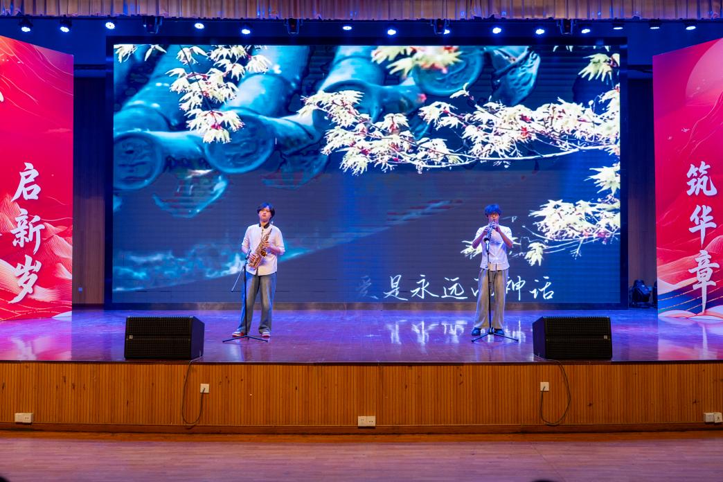 第三篇章以朱柏桦、袁祖政的萨克斯合奏《美丽的神话》温情开启,悠扬婉转的旋律在会场流淌,勾起全场师生的情感共鸣;