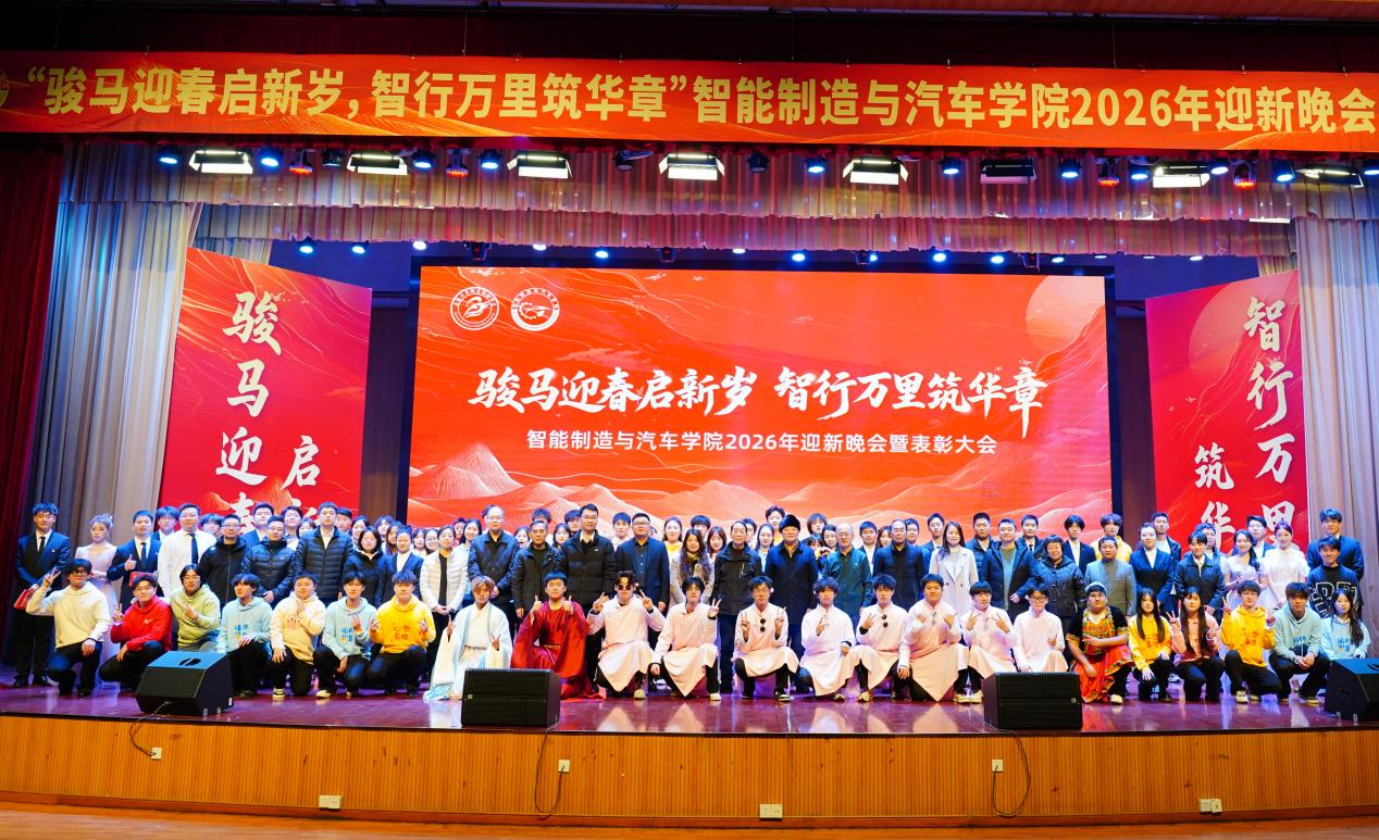 冬日暖阳融暖意,青春盛会启新篇。12月29日下午,智能制造与汽车学院“骏马迎春启新岁 智行万里筑华章”2026年迎新晚会暨表彰大会在我校嘉定校区文体中心隆重举行。这场集文艺表演、专业技能成果展示与先进典型表彰于一体的盛会,不仅为全院师生呈现了一场精彩纷呈的视听盛宴,更凝聚了师生奋进力量,彰显了学院育人成效,为新一年的发展奏响了昂扬序曲。晚会由辅导员彭嘉宁、钟利强,学生谢玲玲、王乾、周雪佳、刘浩轩共同主持,分为“策马踏歌·青春序章”“智汇韶华·艺彩飞扬”“弦音逐梦·桃李芬芳”“师生同心·共赴新程”四个篇章。学校各职能部门负责人,各学院党总支(直属党支部)书记、副书记、各学院团委书记、智能制造与汽车学院教师代表及2025级新生共计1200余人参与活动。
