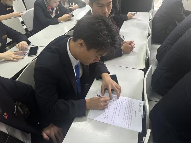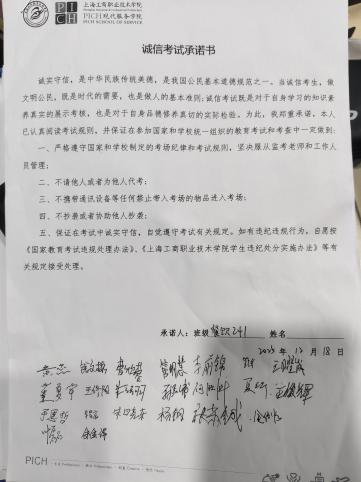 各班组织开展了“诚信考试”主题班会,通过案例分析、小组讨论等方式,深入探讨了考试作弊的危害和后果。此外,学院还组织开展了诚信考试签名承诺活动,全体同学在 “诚信考试承诺书” 上郑重签下自己的名字,承诺以诚信为本,遵守考场纪律,用真实的成绩检验自己的学习成果。