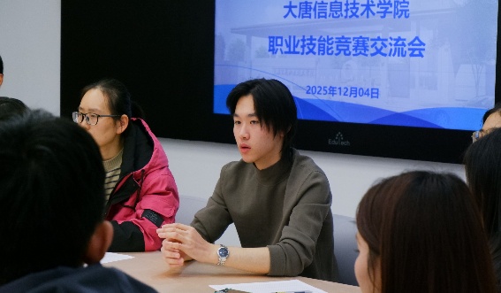 大唐信息技术学院院长俞蝶琼谈道:“‘以赛促教、以赛促学、以赛促创’是学院育人理念的生动践行。本次分享会不仅是获奖成果的展示,更是一场思想的接力、精神的传承。希望同学们将今日所学化为明日行动,在未来的赛场上挥洒才情、绽放光彩,学院也将不断完善竞赛培养体系,为你们的成长保驾护航。”